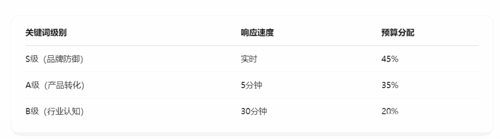 • 三层防御体系:品牌词 → 产品词 → 行业词
