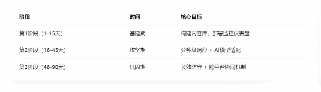 为了让企业内容不只是“一次性上榜”,而是持续在AI中保持存在,我们建议采用以下机制:实施路线图:90天打造AI内容攻防能力