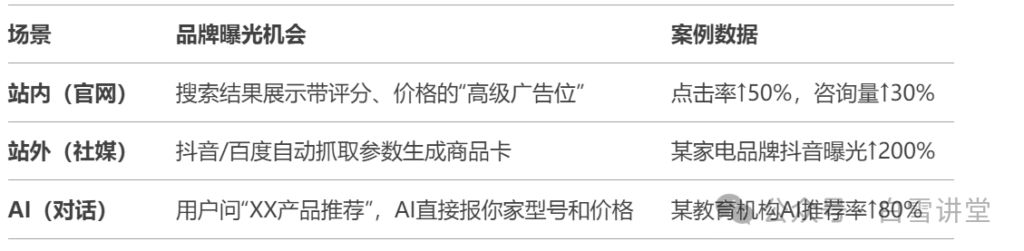 AI直接引用Schema标记的参数(如“最低价¥199”)生成答案,用户无需访问官网即可决策。 - 全域流量协同: