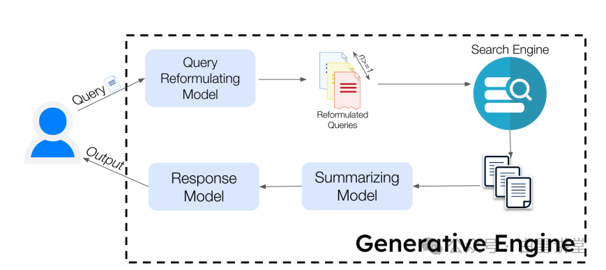生成式引擎主要由一组生成模型和一个用于检索相关文档的搜索引擎构成。生成式引擎以用户查询为输入,通过一系列步骤生成基于检索来源的最终响应,并在响应中嵌入内联引用以标明信息来源。