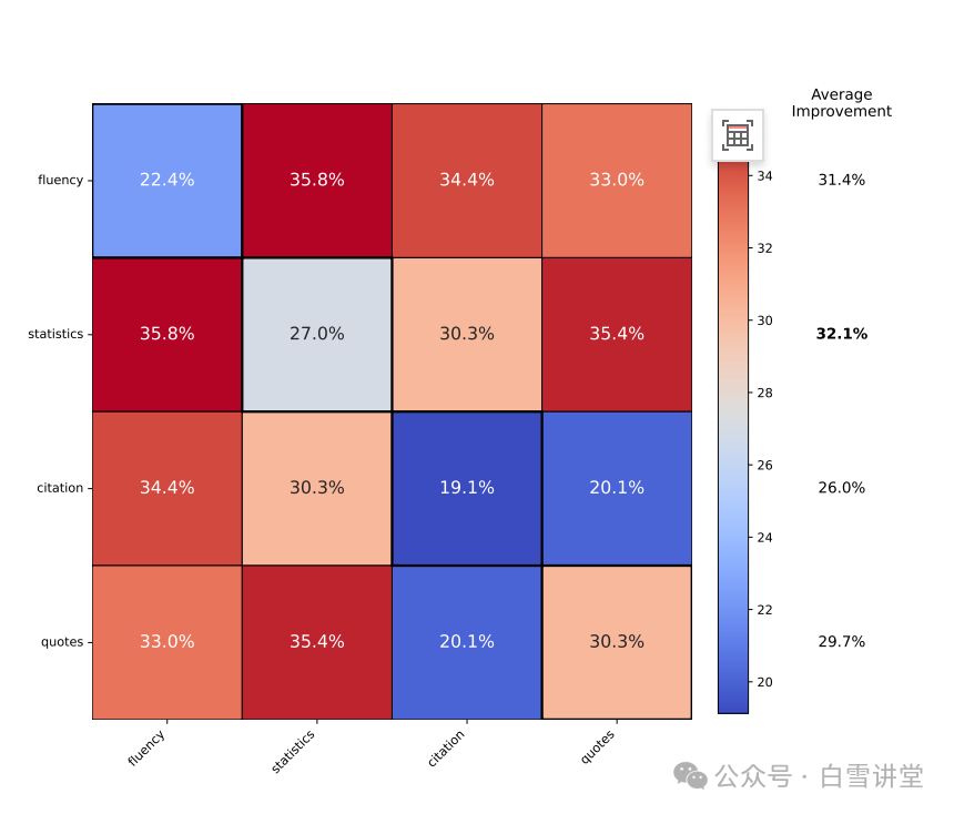 图 4:使用 GEO 策略组合的相对改进情况。同时使用流畅性优化和添加统计数据可带来最佳性能。最右侧一列表明,将流畅性优化与其他策略结合使用最为有益。