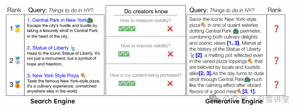 - 对内容创作者的影响:生成式引擎的普及对内容创作者构成了挑战。由于其黑盒性质和快速迭代,创作者难以控制内容的展示方式,可能导致网站流量下降和可见性降低。