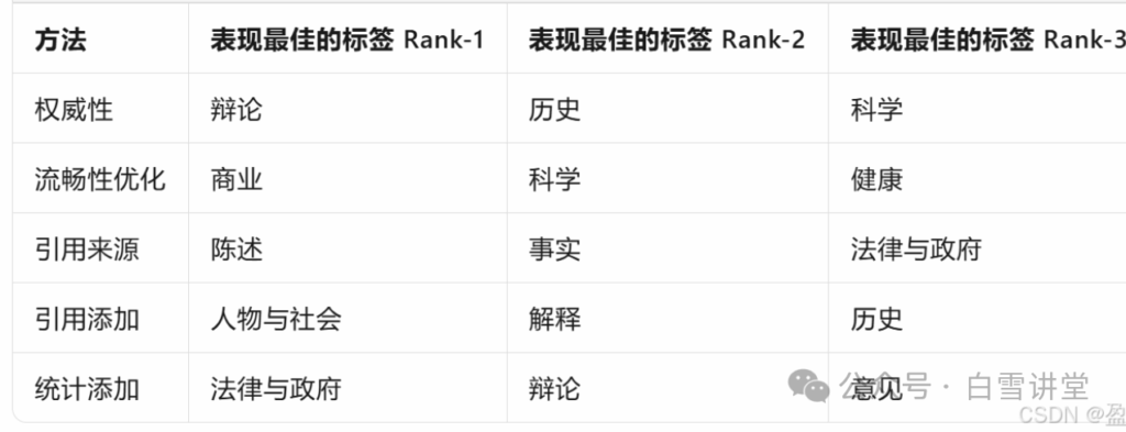 表3:每种GEO方法表现最佳的类别。网站所有者可以根据他们的目标领域选择相关的GEO策略。