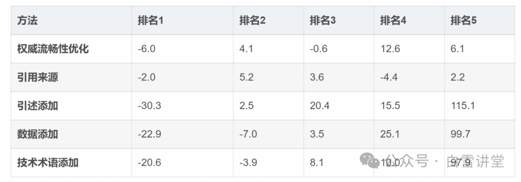 - 最佳方法:引用来源、引述添加和数据添加等方法效果显著。
